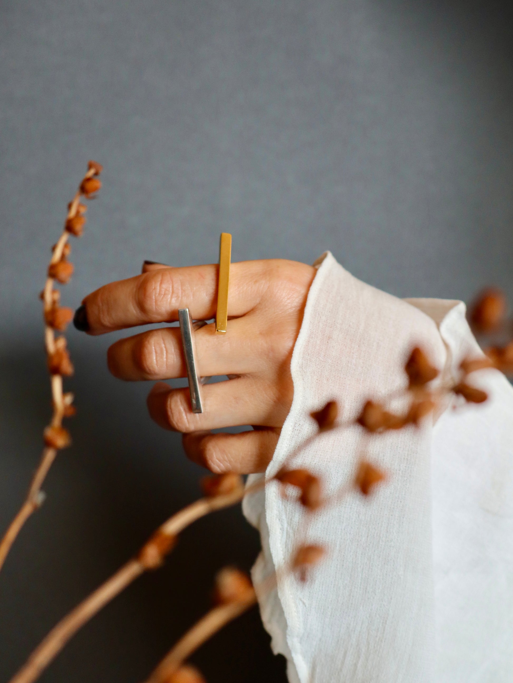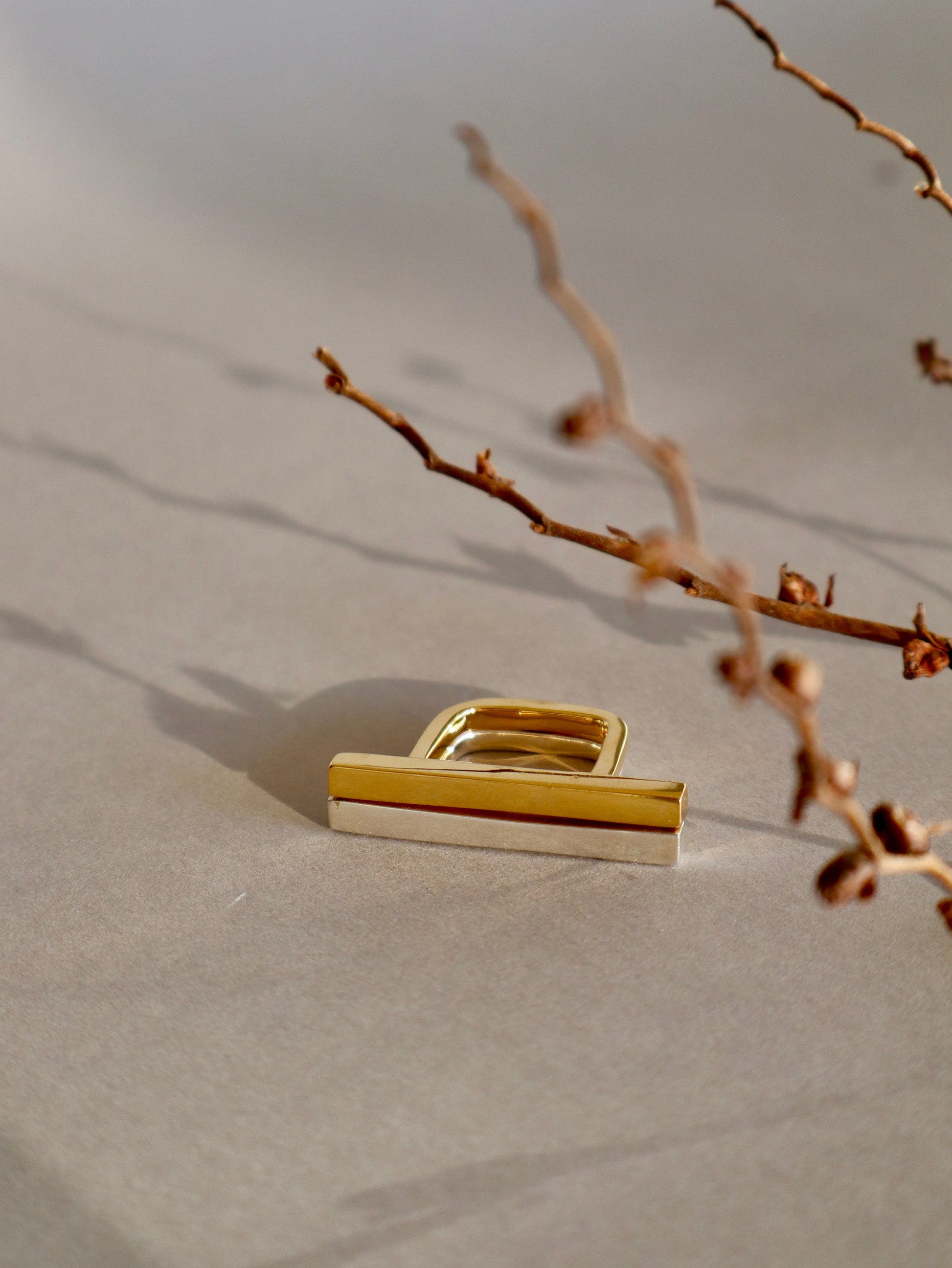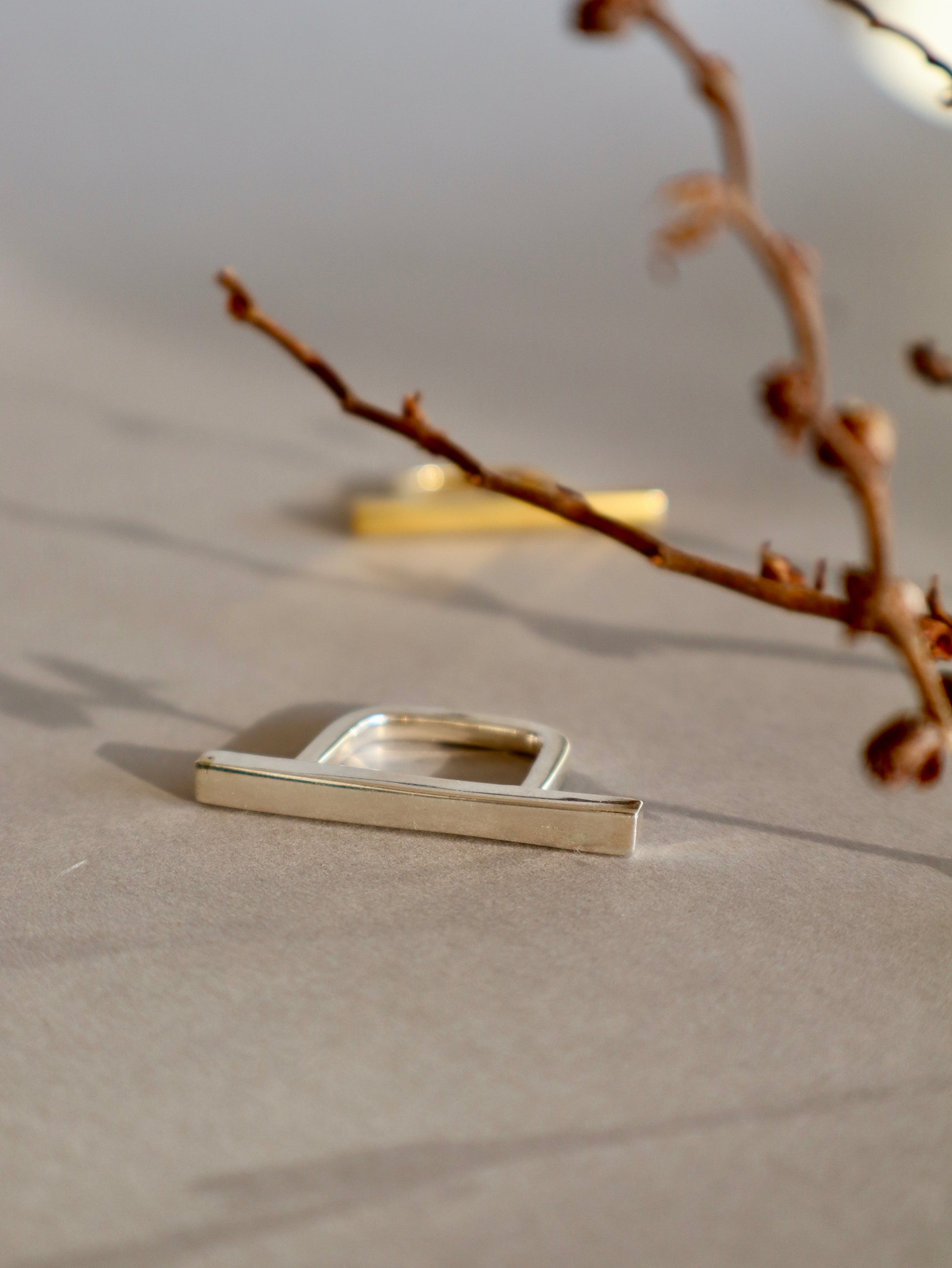 Pieza geométrica unitalla, creado con la técnica distintiva de trabajar directamente sobre el metal. Anillo que fusiona la esencia geométrica con la solidez intrínseca del metal.