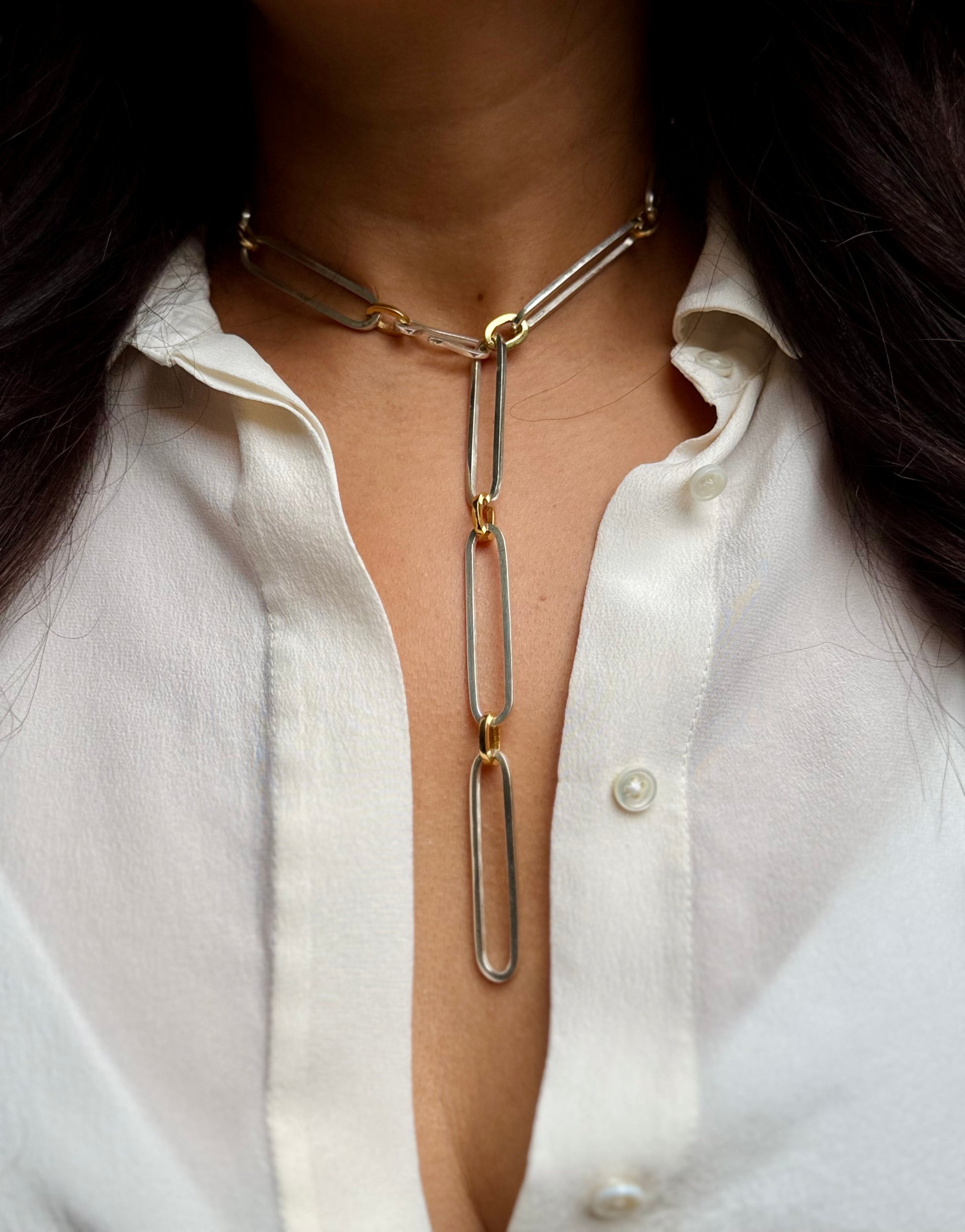 Cadena de eslabones unitalla, una pieza versátil que con su broche te permite acomodarla de tres largos destinos y jugar con ella para que se adapten a tu outfit.